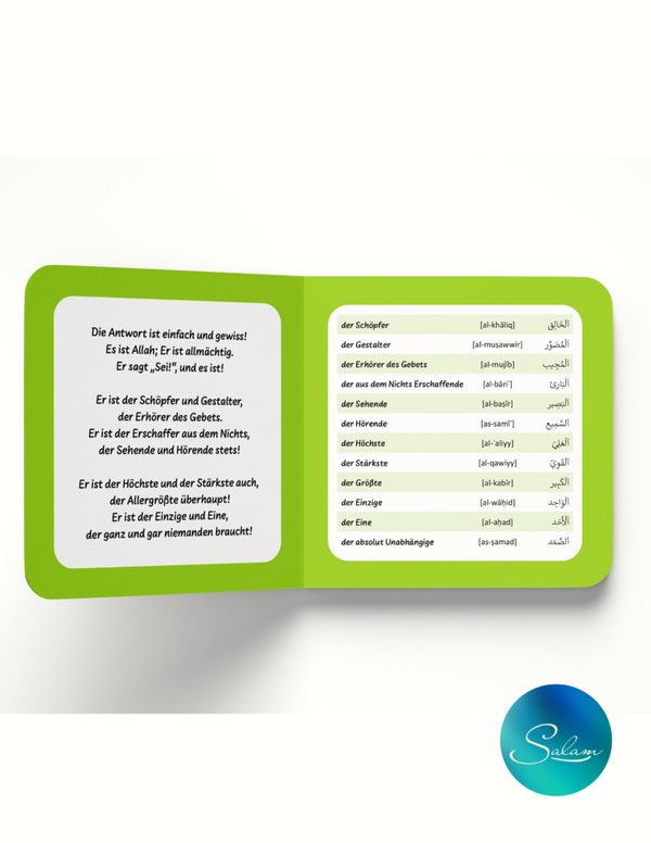 Während die Fragen schon in den Kleinsten ein Bewusstsein für die wunderschöne Schöpfung Allahs wecken, erfahren sie in den Antworten, wer Allah ist, und lernen einige Seiner Namen und Eigenschaften kennen.