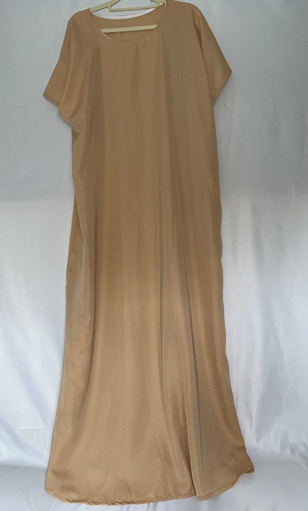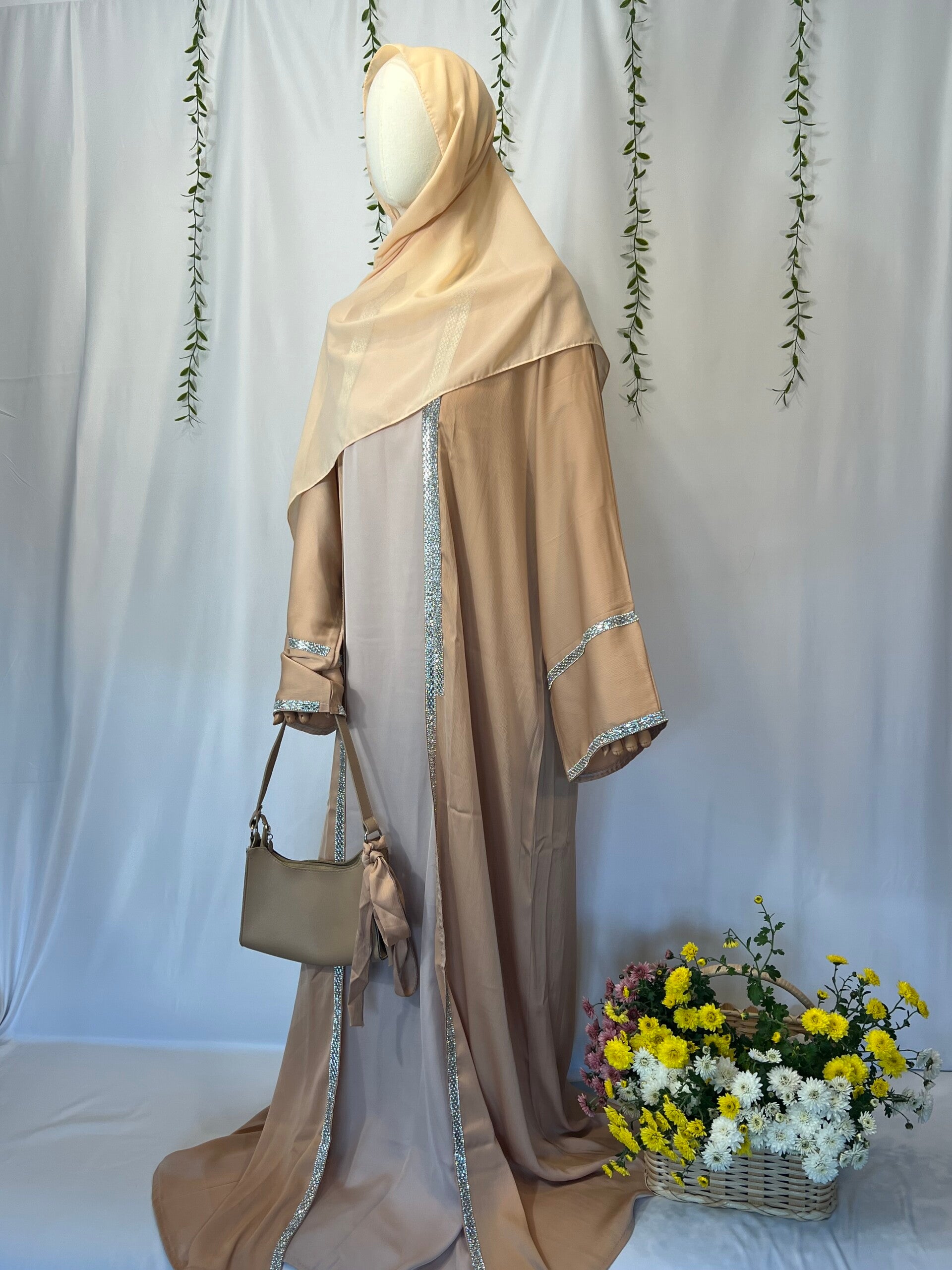 Diese Abaya verbindet ein modernes Design mit femininer Note. Sie wird mit Gürtel und Kopftuch geliefert und wirkt durch die silbernen Details besonders festlich. Damit die Ärmel beim Bewegen nicht nach vorne rutschen, sind sie bis zur Hälfte sorgfältig zugenäht.