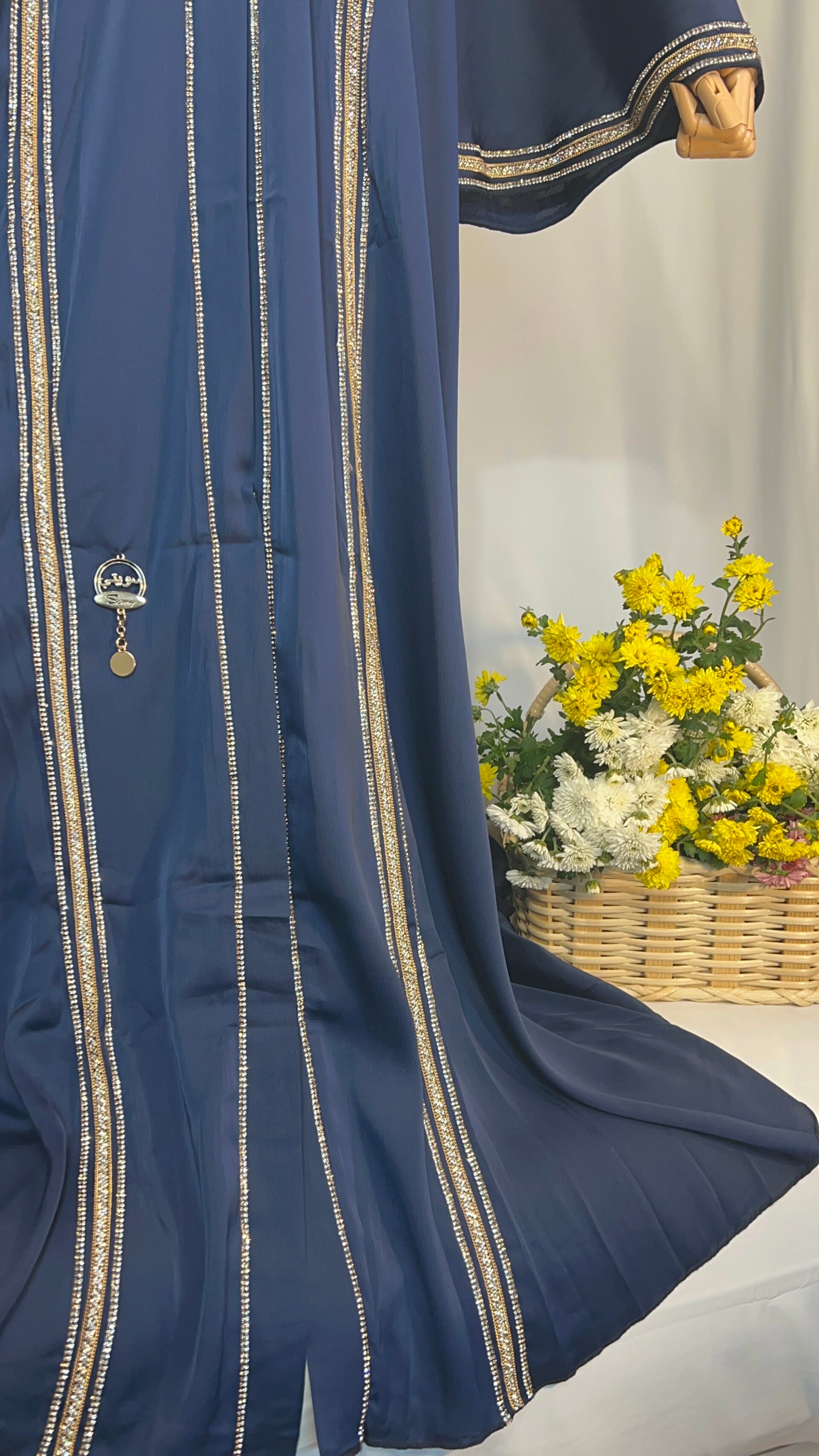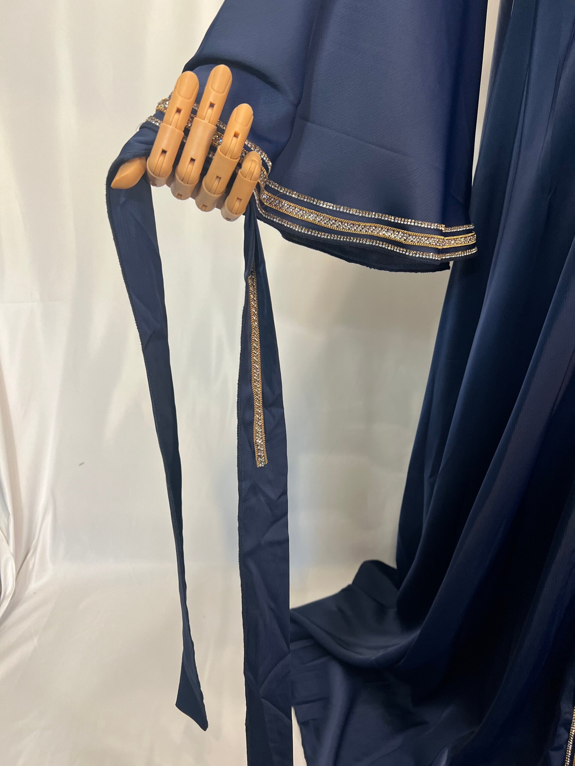 Eine luxuriöse Abaya in tiefem Nachtblau. Die goldenen Stickereien setzen edle Highlights und machen dieses Modell zu einem besonderen Blickfang. Mit Gürtel und Kopftuch lässt sie sich individuell tragen. Die Ärmel sind zur Hälfte genäht, sodass sie immer in Form bleiben.